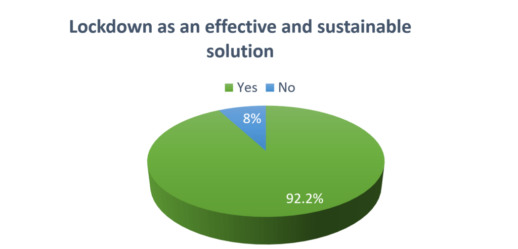 Literature suggests that Indic culture and Hinduism, in particular as a doctrine has a better and more grounded understanding of uncertainty than other knowledge or belief paradigms. ‘The strength of a Civilization may very well be judged by many attributes. Yet at its core the strength lies in the interpretation of the unknown. The relationship with the unfathomable defines a Civilization. The coming to terms with incertitude has a few valid paths, some may find solace in belief, or some may continue seeking. The age of enlightenment has found no path of certitude. The path is unknown. Acceptance of the unknown itself is a path. This acceptance leads to universal toleration. Non-acceptance will not lead to universal toleration. There is a huge profundity in realizing unknown, from there emerges a knowledge system. That is the genesis of the Indic Knowledge system.’ Our Prime Minister, and a large section of Indic communities intrinsically understand the Indic Knowledge system. Therefore, our communities are innately better prepared for unprecedented situations. Very strangely, India has shown this again in COVID-19 situation under the leadership of our Honorable Prime Minister Sri Narendra Modi. Taking a decision of complete lockdown for a democratic country like India was a huge step which our Prime Minister took at the very right time. The risk was high and it was unknown as well that how the 1.3 billion strong, diverse and expansive population of India will react to this and will it be successful or not? But interestingly it was followed and welcomed by Indians like never before. A real time study[1] of COVID-19 issues, governance and community preparedness in India was conducted and respondents from several states including Delhi, Haryana, Uttar Pradesh, Bihar and Maharashtra were participated. As per the study, more than 95% of the respondents supported the decision of complete lockdown (Figure 1). The decision of complete lockdown was also considered as a sustainable solution by more than 92% of the respondents to control corona virus for a country like India (Figure 2).